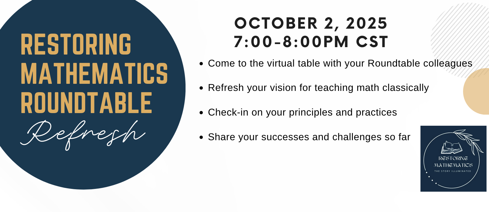 This event is open to anyone who wants to refresh their principles and practices regarding a classical Christian approach to their math classroom. Join us virtually to discuss what’s working in your classroom and be inspired as you hear others’ experiences. Everyone is invited to the table!